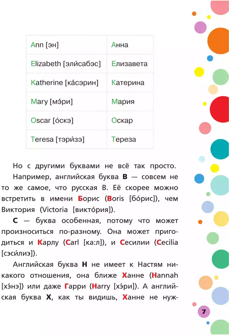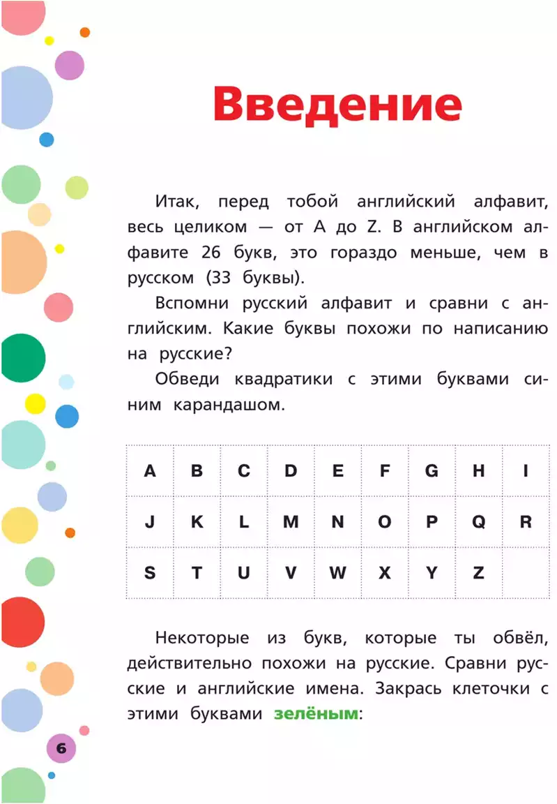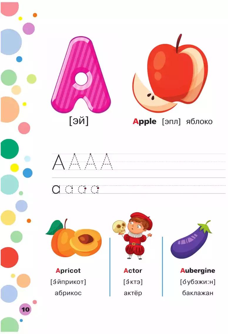 С помощью этой книги дети познакомятся с английским алфавитом, научатся писать буквы и узнают первые слова. Все транскрипции в тексте даны русскими буквами, так что и родители без глубокого знания английского смогут заниматься с ребенком. Кроме того, в книге представлены английские цифры до 20, а в конце учебника детей ждут кроссворды, раскраски и словарик с иллюстрациями, который поможет закрепить материал. Яркие и красочные картинки делают пособие особенно интересным для разглядывания и повторения изученного.